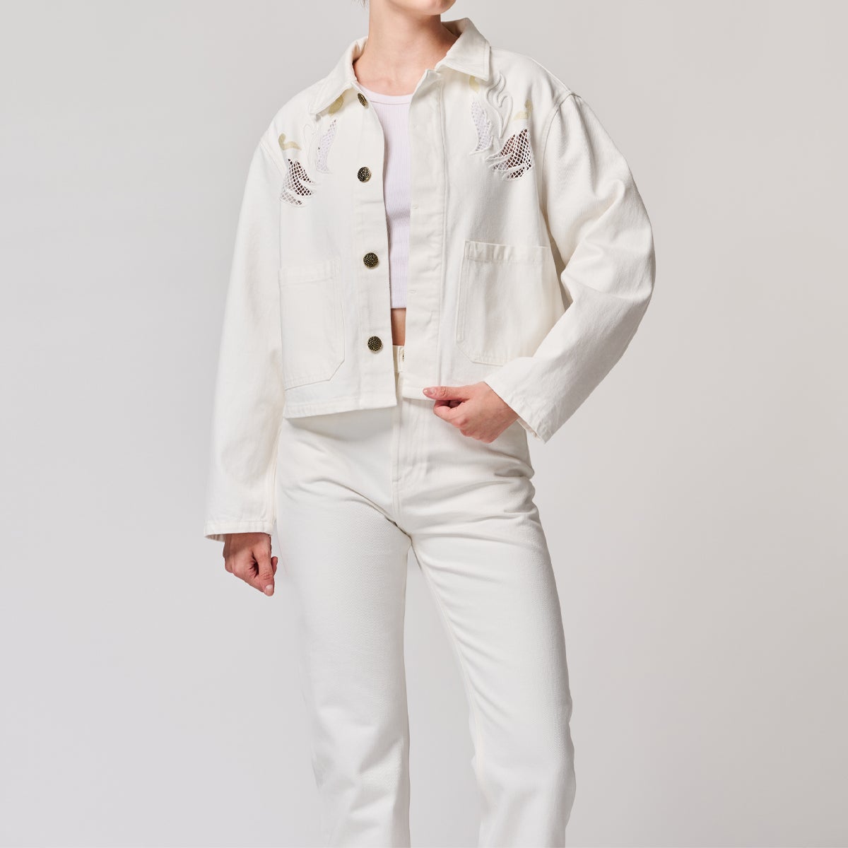 前後に施した刺繍は古代から続く、カットワーク技法を用いた豪華な刺繍装飾となっています。